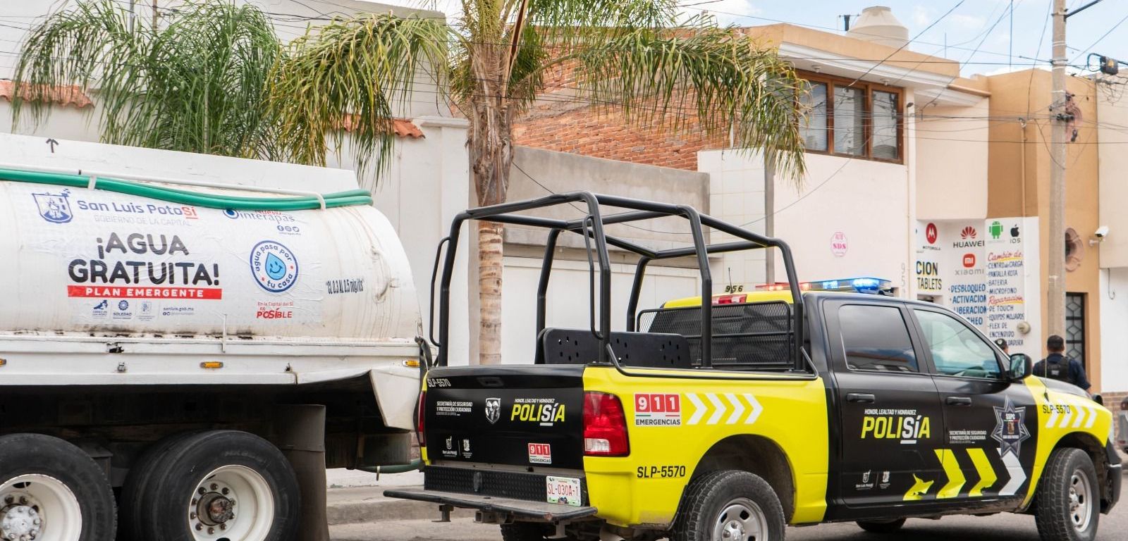 La Secretaría de Seguridad y Protección Ciudadana (SSPC) del municipio de San Luis Potosí se ha sumado a las acciones que emprende el Gobierno de la Capital y el Nuevo Interapas, con un operativo de vigilancia y seguridad para la distribución de agua gratuita con pipas.