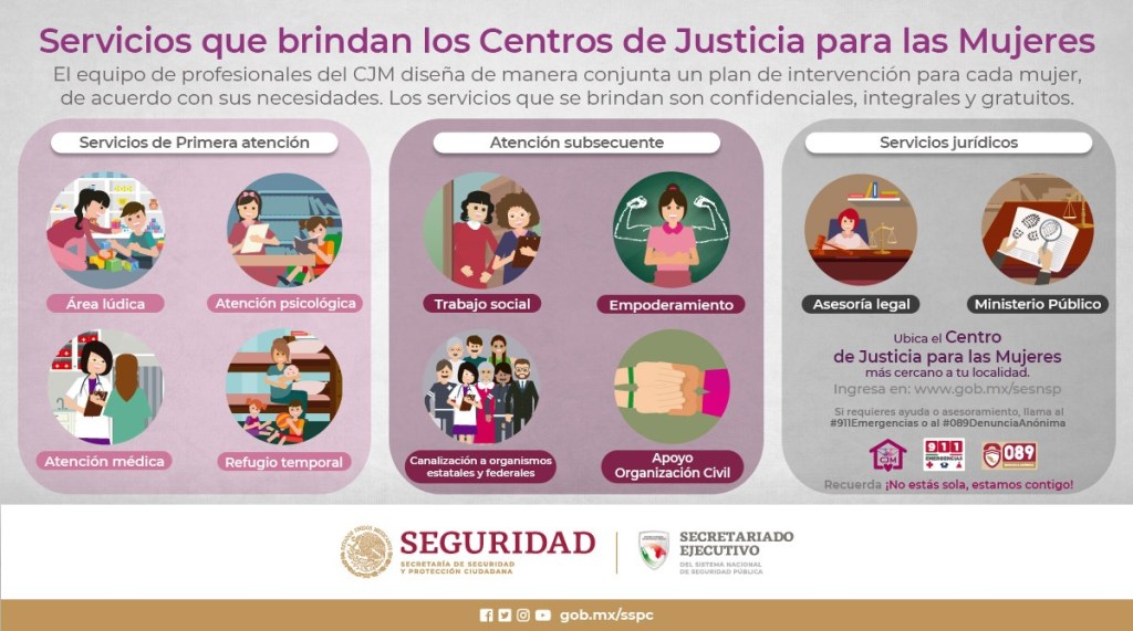 Detalló que, además, la estrategia, diseñado por el Secretariado Ejecutivo del Sistema Nacional de Seguridad Pública (SESNSP), el Centro Nacional de Prevención del Delito y Participación Ciudadana, y la Comisión Nacional para Prevenir y Erradicar la Violencia contra las Mujeres (Conavim), incluye la difusión de las funciones de los CJM, así como los servicios que se ofrecen: atención psicológica y médica; asesoría legal, trabajo social, empoderamiento, refugio temporal y ludoteca.
