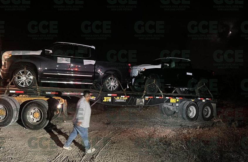 Los agentes de la Guardia Civil Estatal implementaron un dispositivo de búsqueda que tuvo resultados favorables, localizando la unidad que transportaba dos camionetas en los semirremolques en la carretera estatal Ventura-Agave de los Castillos, en la comunidad de Las Flores en el municipio Villa Hidalgo.