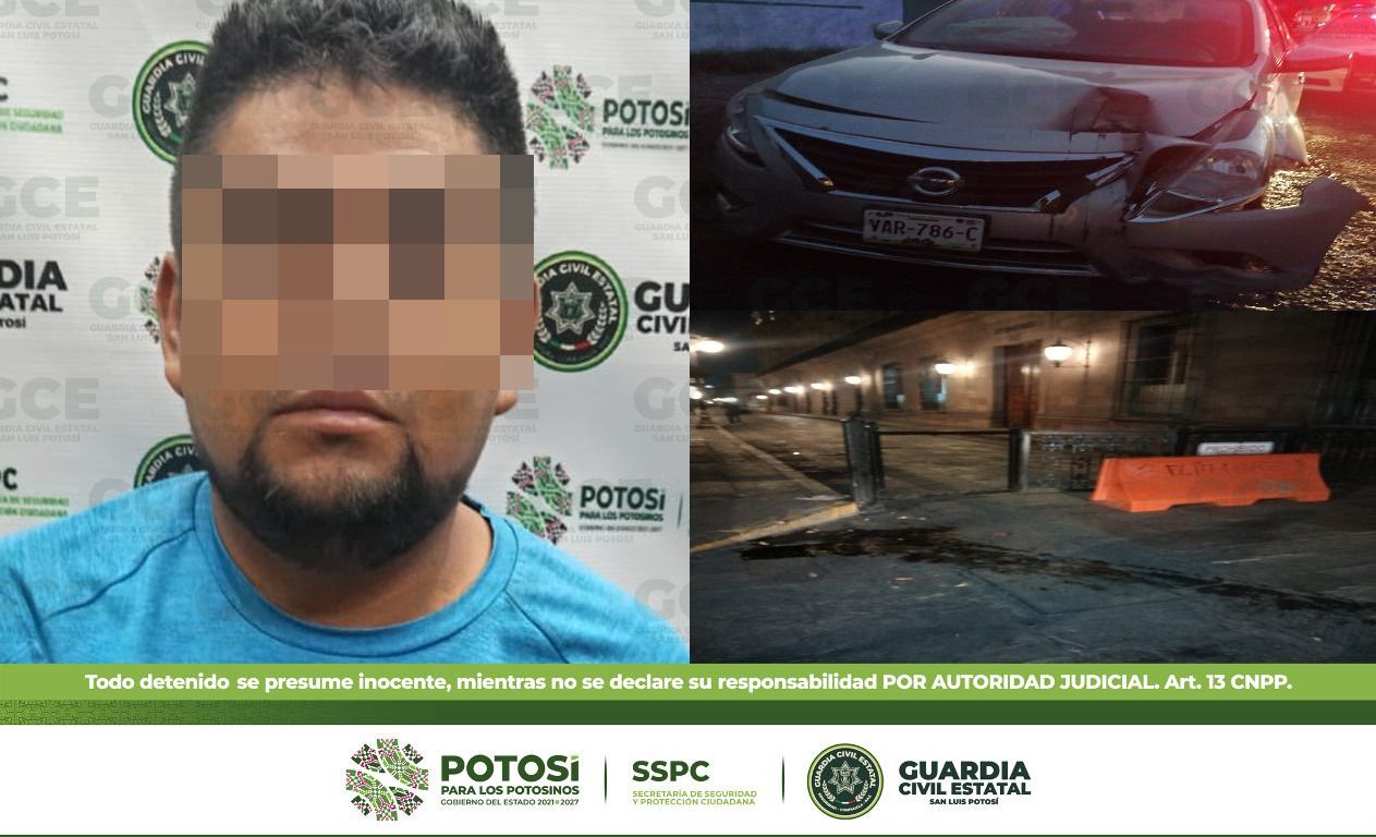 Un choque vehicular contra los barandales que protegen la zona peatonal del Centro Histórico de la capital potosina, derivó en la detención de un automovilista por parte de los elementos de la Guardia Civil Estatal (GCE), quienes procedieron a su aseguramiento por los probables daños a propiedad de Gobierno del Estado.