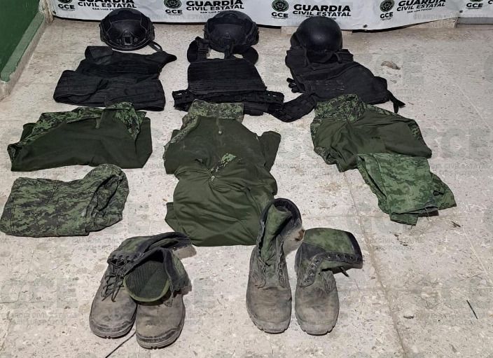 Otro de los hechos fue en el fraccionamiento Llano Sur, lugar en donde aseguraron una camioneta marca Toyota, tipo Tacoma, color negro, con reporte de robo; en su interior se ubicó lo siguiente: tres cascos balísticos en color negro, cuatro camisolas pixeliadas en color verde, dos pantalones pixeledos en color verde, tres chalecos balísticos color negro y dos pares de botas negro con verdes.