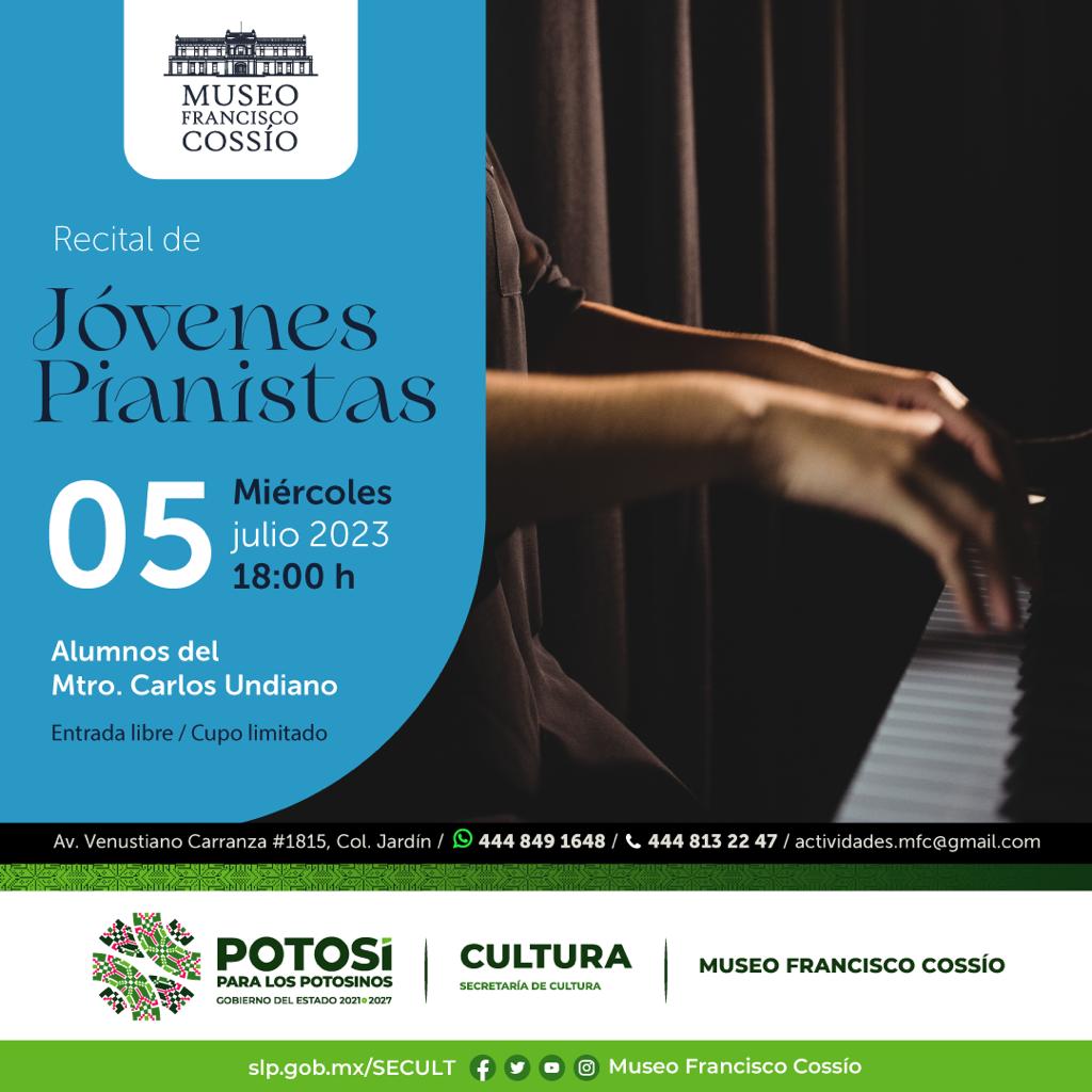 En apoyo a jóvenes talentos, la Secretaría de Cultura de San Luis Potosí, invita al público en general a disfrutar del Recital de Jóvenes Pianistas del Maestro Carlos Undiano, que se llevará a cabo este miércoles 5 de julio a las 18:00 horas, en el Museo Francisco Cossío, con entrada libre y cupo limitado.