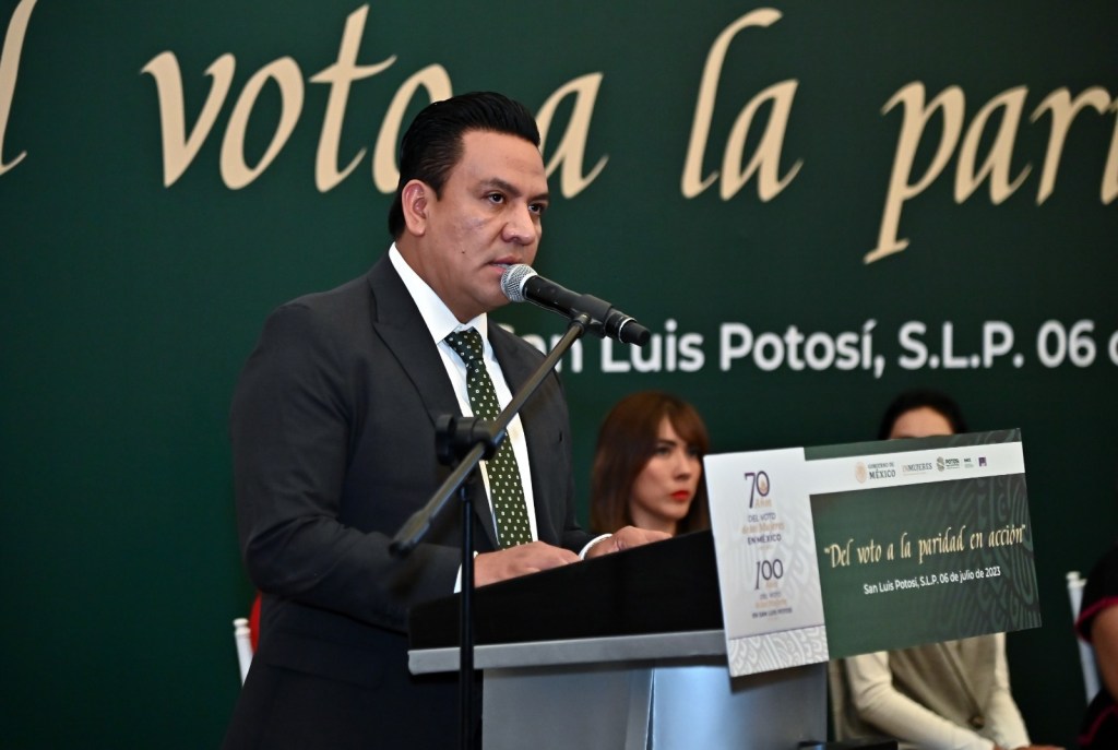 A nombre del Gobernador Ricardo Gallardo Cardona, el secretario general del Gobierno, J. Guadalupe Torres Sánchez, reconoció a aquellas mujeres que se encuentran en puestos de elección de representación, por el trabajo que han realizado en favor del ejercicio efectivo de los derechos políticos de las mujeres y la gran lucha que han recorrido para lograr la paridad de género
