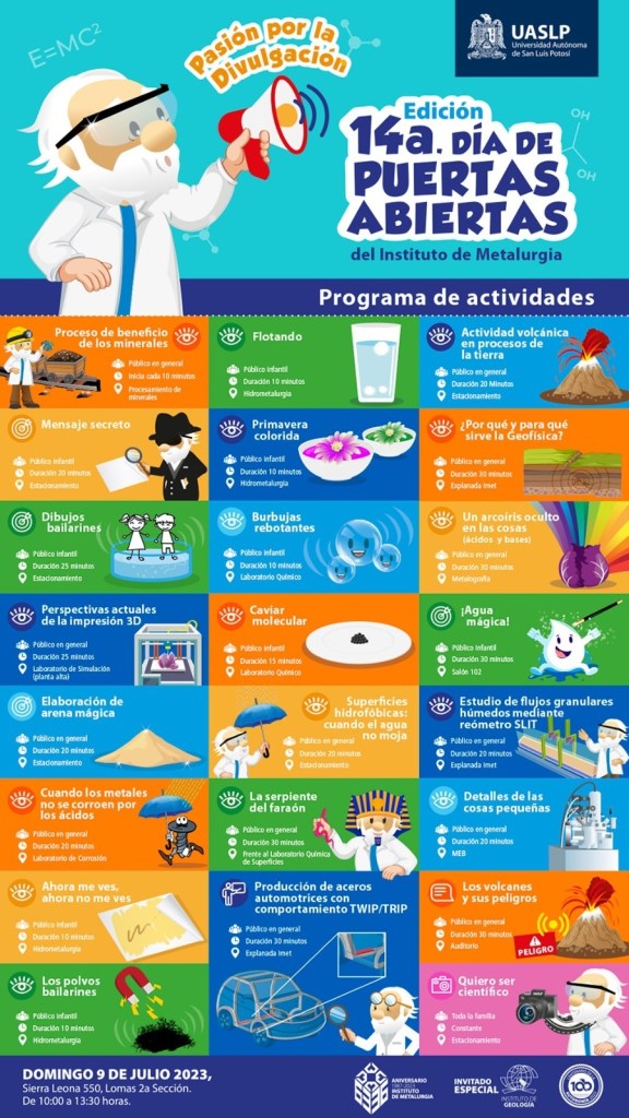 La Universidad Autónoma de San Luis Potosí a través del Instituto de Metalurgia llevará a cabo la edición número 14 del Día de Puertas Abiertas, “Pasión por la Divulgación”, evento tradicional que tiene como principal enfoque el acercamiento de las y los niños a la ciencia, y que tendrá lugar el domingo 09 de julio de 2023, en un horario de 10:00 a 13:30 horas, en las instalaciones del Instituto, ubicado en Sierra Leona No. 550, Lomas 2ª. Sección.