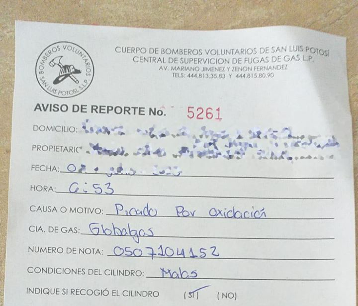Una vez hecho el reporte, la estación de bomberos acudió de inmediato y se llevó el cilindro ya que representaba según dijeron un peligro latente, y recomendaron hacer una denuncia contra la empresa por tratarse de un riesgo muy grave.