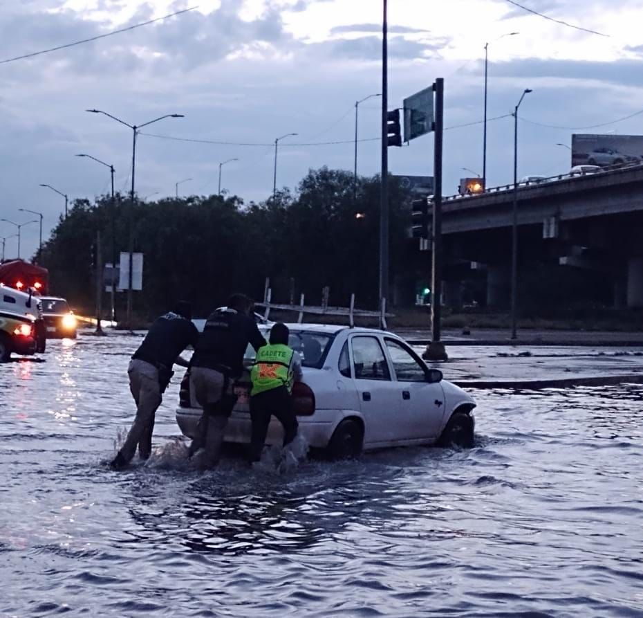 Oficiales de Policía Vial y Cadetes del Instituto de Profesionalización Policial brindaron apoyo a automovilistas en las inmediaciones de Carretera 57 y el Eje 116 donde se realizó el cierre momento del carril lateral para evitar riesgo por la subida de agua en la zona. Ahí se remolcaron varios vehículos particulares y de transporte de personal que quedaron varados.