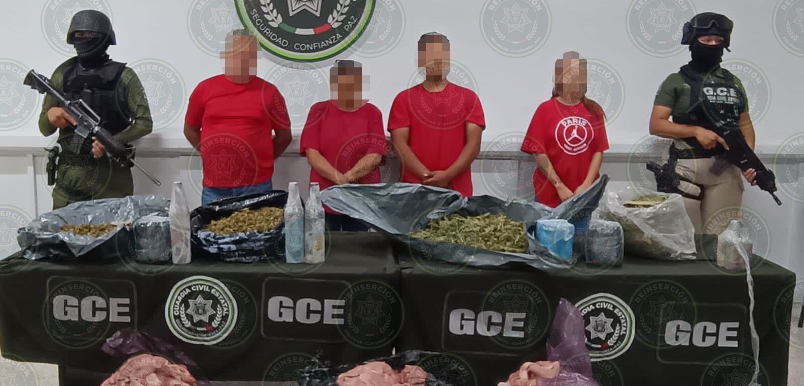 Samuel N de 53 años de edad conducía la camioneta, le acompañaban su esposa Wendy de 51 años de edad, su hijo Alan de 21 años de edad y su nuera André de 26 años de edad. Al inspeccionar la parte posterior del vehículo se encuentran 3 cubetas con capacidad de 20 litros en su interior con algunas partes de carne y en el inferior una hierba verde y seca con las características físicas de la marihuana, así como 3 botellas de licor.