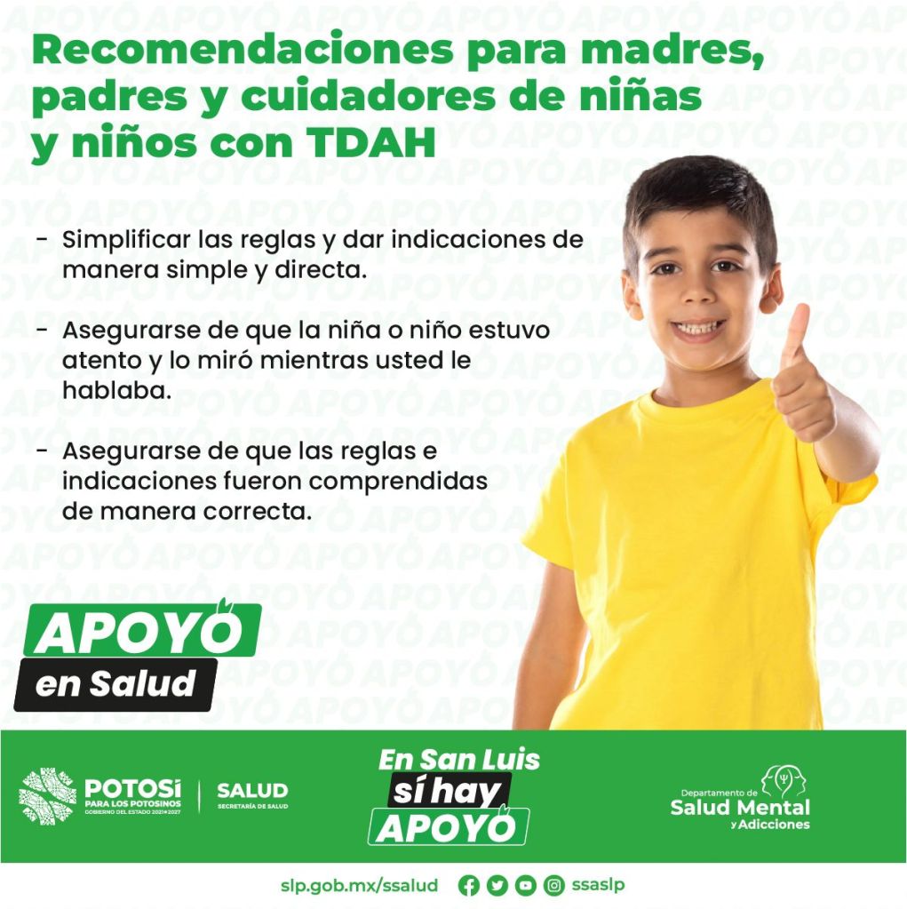 Si cree que su hijo/a pueda tener TDAH busque ayuda profesional, para recibir un diagnóstico y tratamiento adecuado, acuda a su Centro de Salud correspondiente, y en caso de requerir atención será referido al Centro Integral de Salud Mental (CISAME). En caso de urgencia, puede recibir atención especializada en la Clínica Psiquiátrica Dr. Everardo Neumann Peña ubicada en Carretera Matehuala kilómetro 8, fracción los Olivos en Soledad de Graciano Sánchez, S.L.P. Teléfono: 444 100 9250.