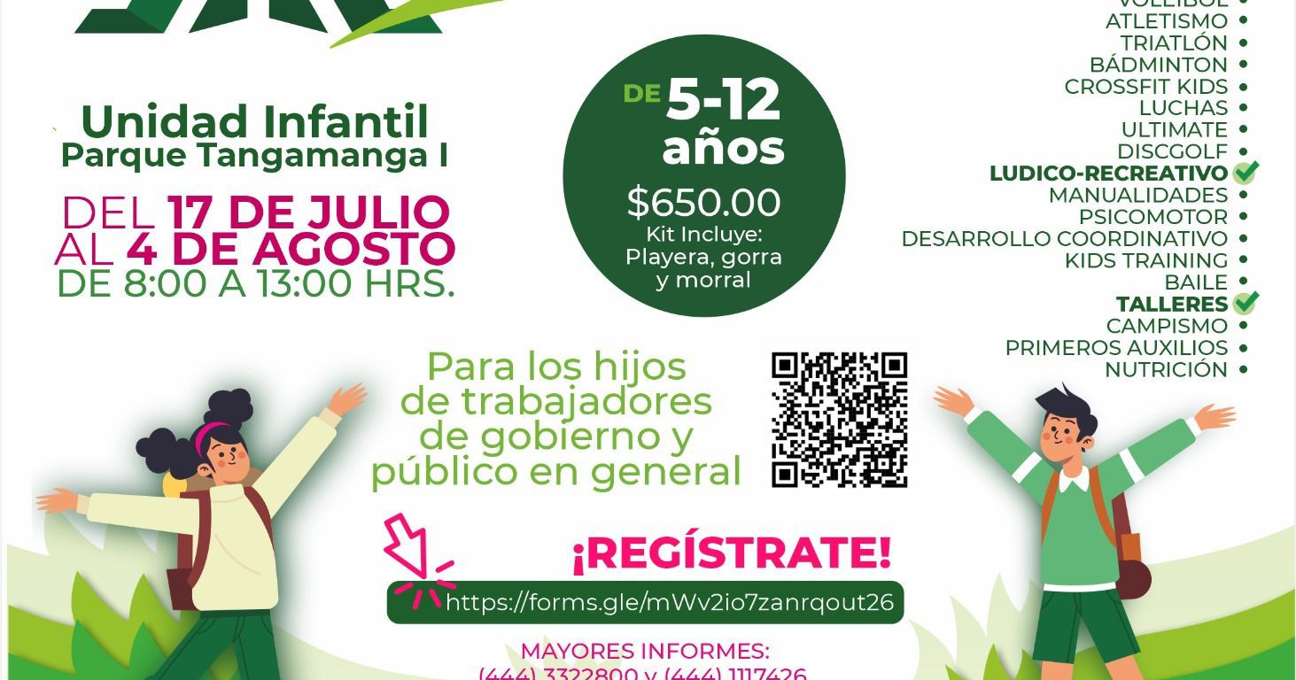 Detalló que este campamento es posible gracias al trabajo coordinado entre la Secretaría de Cultura (Secult) y los parques Tangamanga, por lo que se contarán con actividades deportivas como futbol, basquetbol, voleibol, atletismo, bádminton, crossfit kids, discgolf entre otras; actividades lúdico-recreativas como manualidades, psicomotoras, de desarrollo coordinativo, baile y visitas guiadas a los museos Federico Silva, Nacional de la Máscara, Teatro de la Paz y sus galerías, Laberinto de las Ciencias y las Artes y de Arte Contemporáneo.
