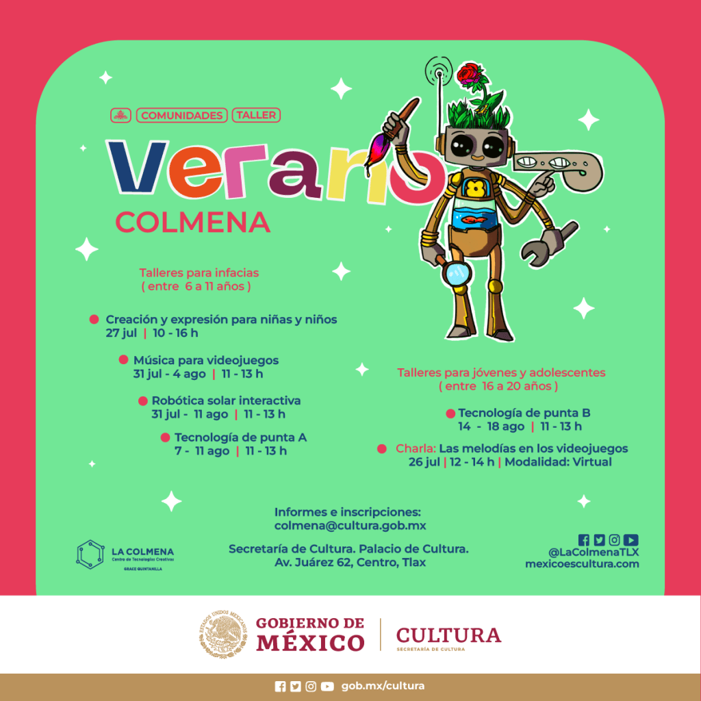 En el Palacio de Cultura de Tlaxcala, sede de la Secretaría de Cultura federal, La Colmena: Centro de Tecnologías Creativas Grace Quintanilla tendrá diversos talleres y charlas que conforman el programa Verano Colmena. Para infancias entre los 8 a 11 años, se realizarán los talleres “Creación y Expresión para niñas y niños”, “Robótica solar” y “Tecnología de punta A”. Para adolescentes y jóvenes a partir de los 16 años habrá la charla virtual “Las melodías en los videojuegos”, así como los talleres “Música para videojuegos” y “Tecnología de punta B”, de manera virtual y presencial, respectivamente. Las fechas de inscripción y horarios, se podrán consultar en las redes sociales de La Colmena.