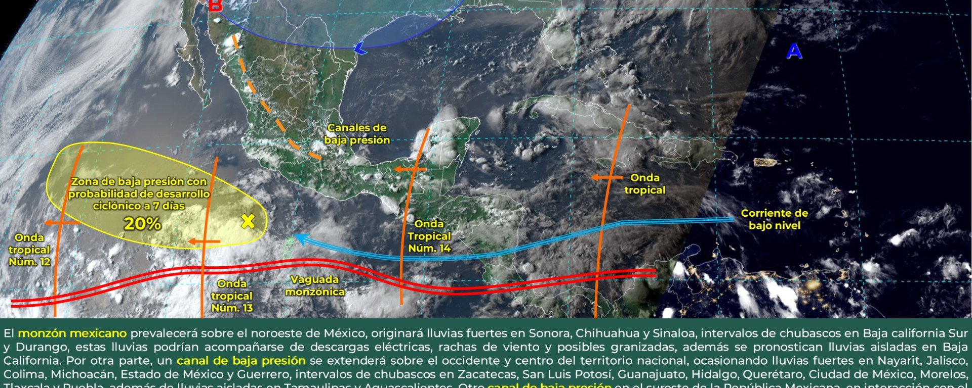 Intervalos de chubascos (5 a 25 mm): Baja California Sur, Sinaloa, Durango, Nayarit, Guanajuato, Puebla, Hidalgo, Estado de México, Ciudad de México, Tlaxcala y Morelos.