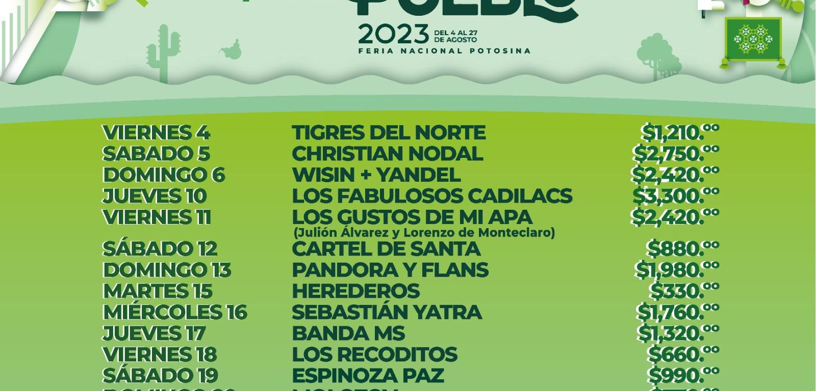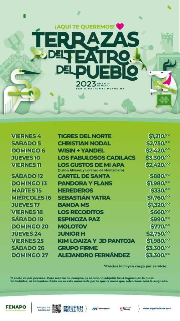Serán 24 días de fiesta en las que las y los potosinos podrán disfrutar de artistas de talla internacional como los Fabulosos Cadillacs, Alejandro Fernández, Grupo Firme, Junior H, entre otros, e hizo un llamado a los fans para que aprovechen la oportunidad de disfrutar de espectáculos que en otras partes del país se presentan a altos costos.
