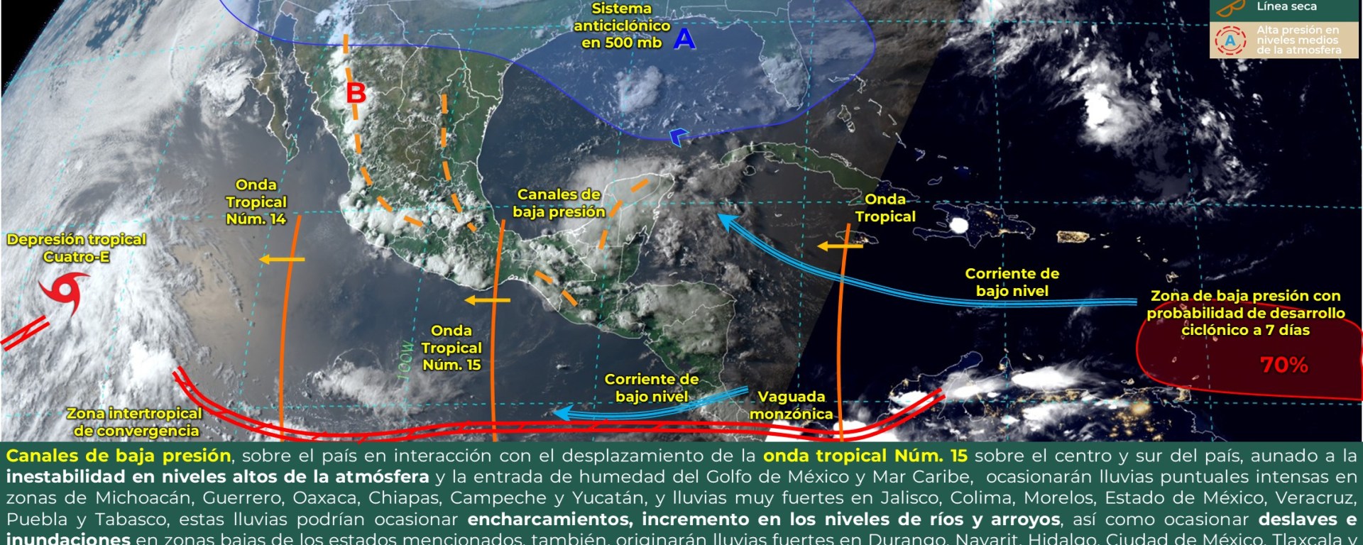Lluvias fuertes con puntuales muy fuertes (50 a 75 mm): Sonora, Chihuahua, Sinaloa, Jalisco, Colima, Guerrero, Oaxaca, Veracruz y Campeche.