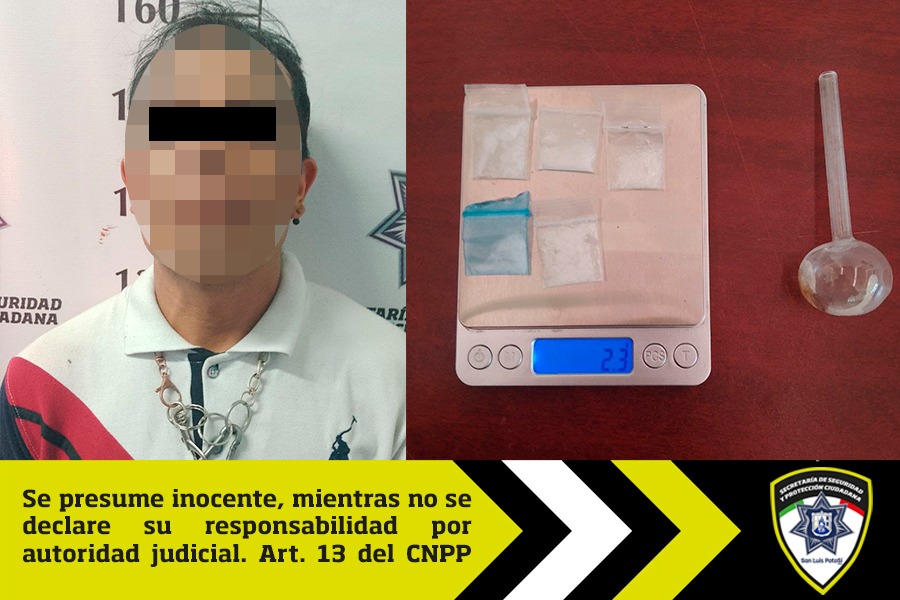 Como resultado de los patrullajes de vigilancia en el cuadrante sur, agentes de Guardia Municipal de la Secretaría de Seguridad y Protección Ciudadana (SSPC) llevaron a cabo el aseguramiento de un hombre que fue detectado consumiendo enervantes en vía pública, en una revisión preventiva de seguridad, se le encontraron cinco dosis de polvo blanco granulado con las características de la droga conocida como cristal.