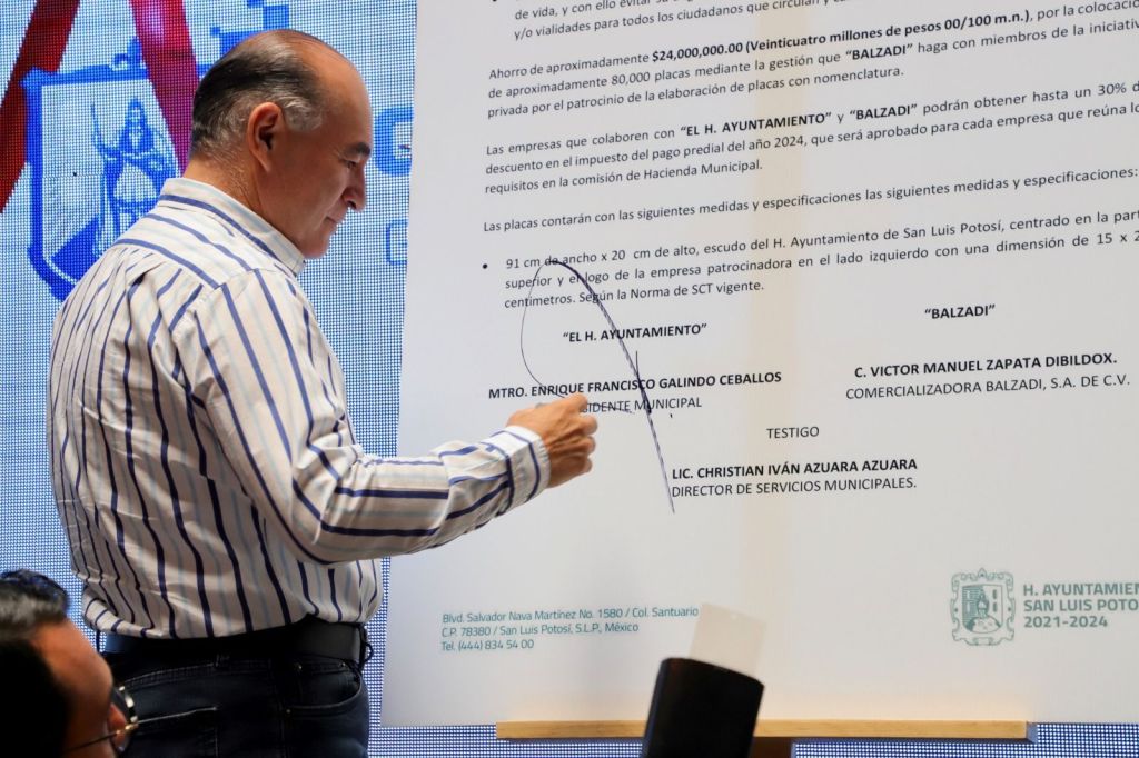 En el marco del programa “Mi Avenida, Mi Ciudad”, el Alcalde Enrique Galindo Ceballos firmó un convenio con la empresa Balzadi, con el fin de renovar las placas de nomenclatura oficial de calles y avenidas de la Capital, por lo que se fabricarán 80 mil placas como parte del rescate de nuestra ciudad para hacerla más funcional. El Presidente Municipal explicó que mediante el patrocinio de la señalética, personas, empresas y asociaciones contribuirán para colocar los nombres “a nuestras Vialidades Potosinas. Quienes nos patrocinen tendrán el beneficio de colocar sus nombres o logotipos en las placas, además de que, al sumarse a este proyecto, podrán ser acreedores a estímulos fiscales”.