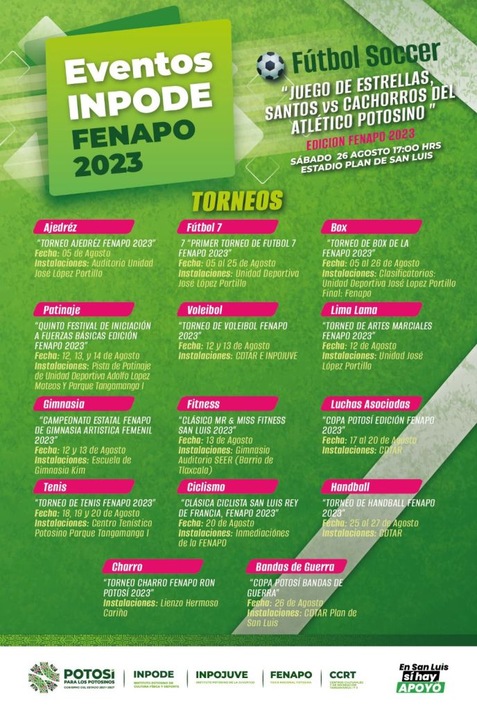 En San Luis Potosí sí hay apoyo en todas las disciplinas, por lo que en el marco de la Feria Nacional Potosina (Fenapo) edición 2023, que se realizará del 4 al 27 de agosto, el Estado será sede de más de 25 torneos y actividades atléticas, las cuales tendrán un impacto nacional e internacional que permitirá fortalecer el tejido social y contribuir al crecimiento económico local.