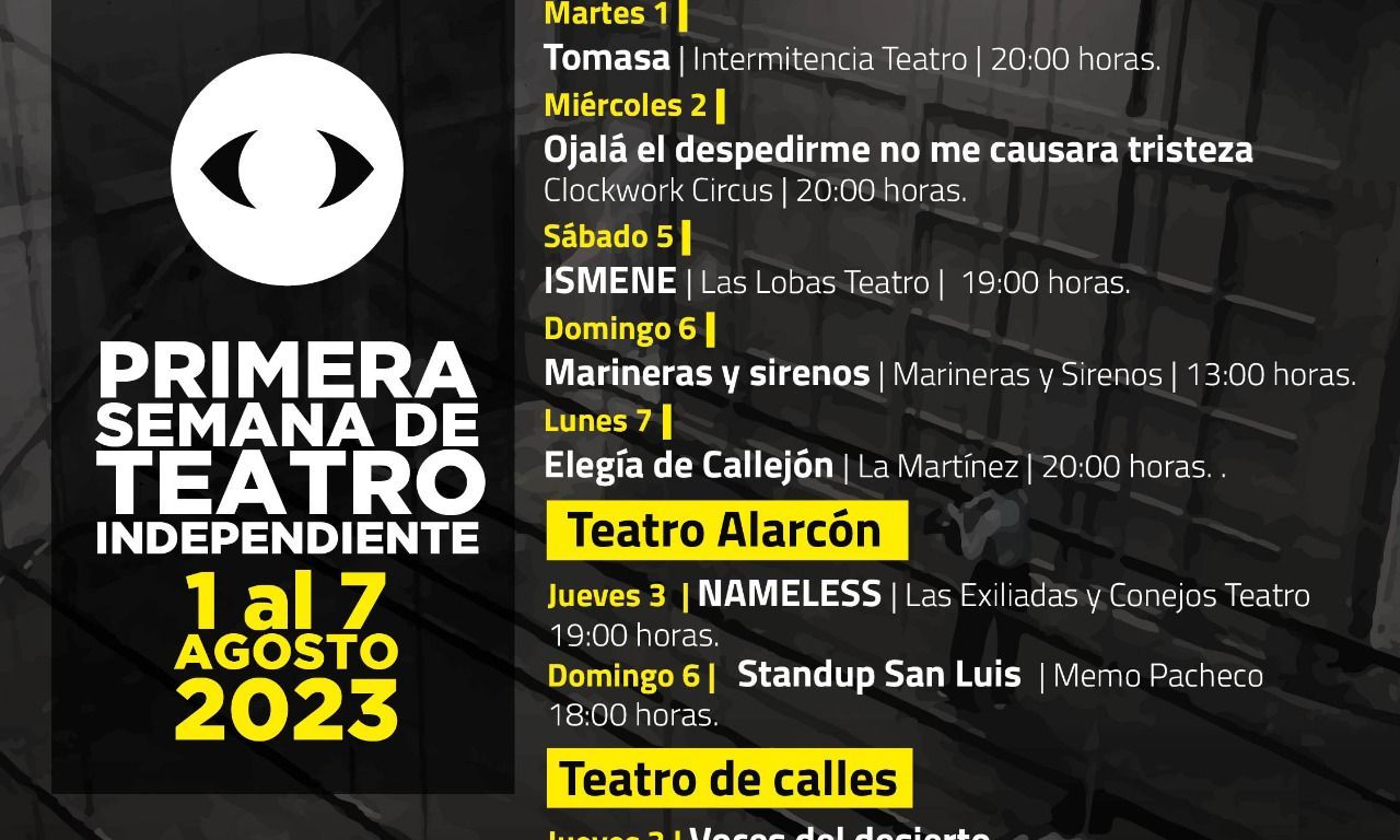 Con artistas potosinos que son parte del Catálogo Potosino de Artistas (CAPO), el Gobierno de la Capital prepara la Primera Semana de Teatro Independiente en cuatro sedes del Centro Histórico: Teatro Alarcón, Teatro El Rinoceronte Enamorado, y el apartado público que involucra Plaza de Armas y Plaza del Carmen.