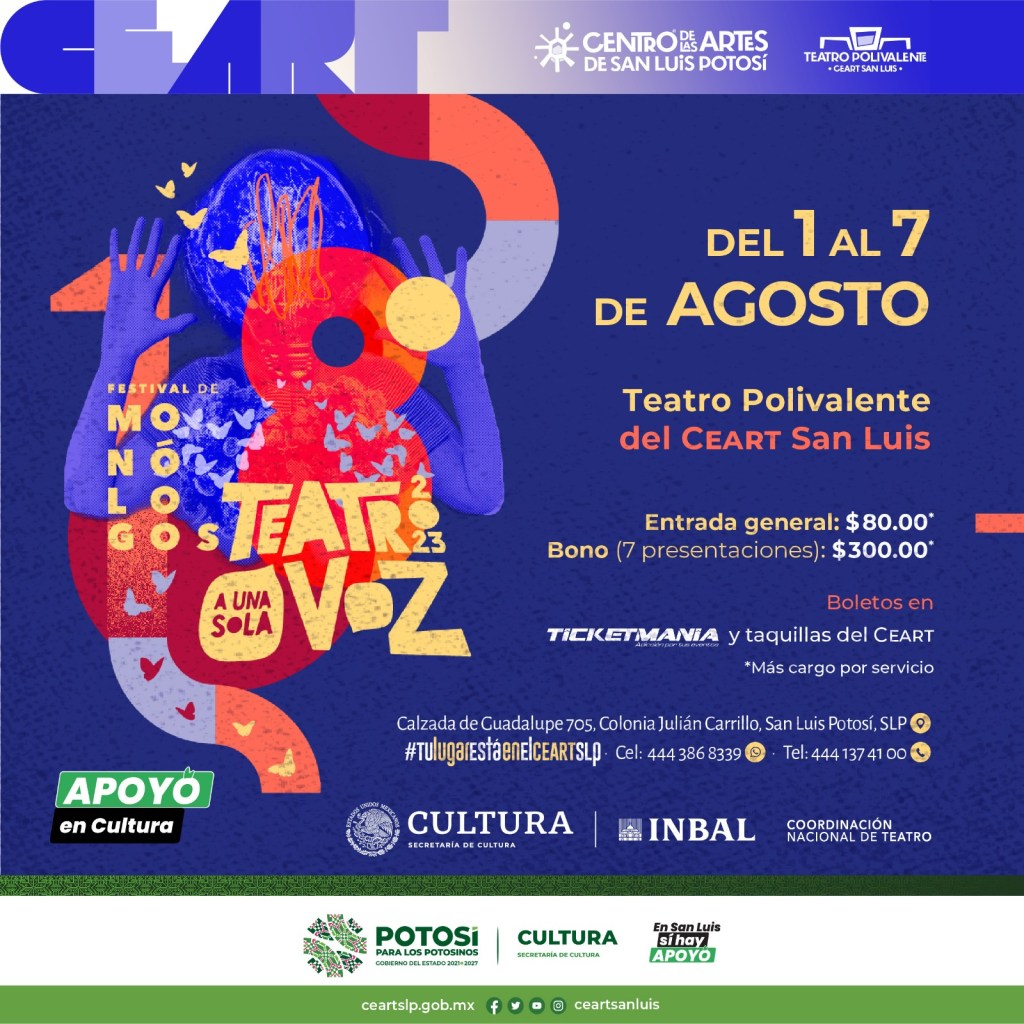 En San Luis sí hay apoyo a la cultura y a las diferentes expresiones artísticas, con el 18° Festival de Monólogos a «Teatro a una sola voz», que se realizará en la Entidad del 1 al 7 de agosto en el Teatro Polivalente del Centro de las Artes en el que se ofrecerá a visitantes locales, nacionales y extranjeros siete obras escritas, producidas, dirigidas e interpretadas por talento mexicano.