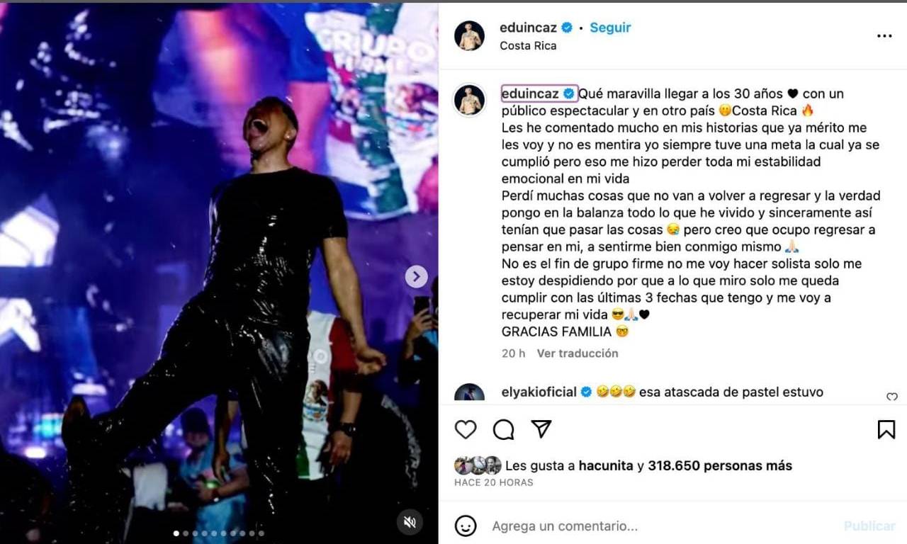 Eduin Caz, vocalista de Grupo Firme, dará uno de sus últimos conciertos en el Teatro del Pueblo de la Feria Nacional Potosina (Fenapo) edición 2023, luego de que anunció a través de sus redes sociales que se retirará de su carrera musical, pero antes cumplirá con tres fechas que le restan con el grupo.
