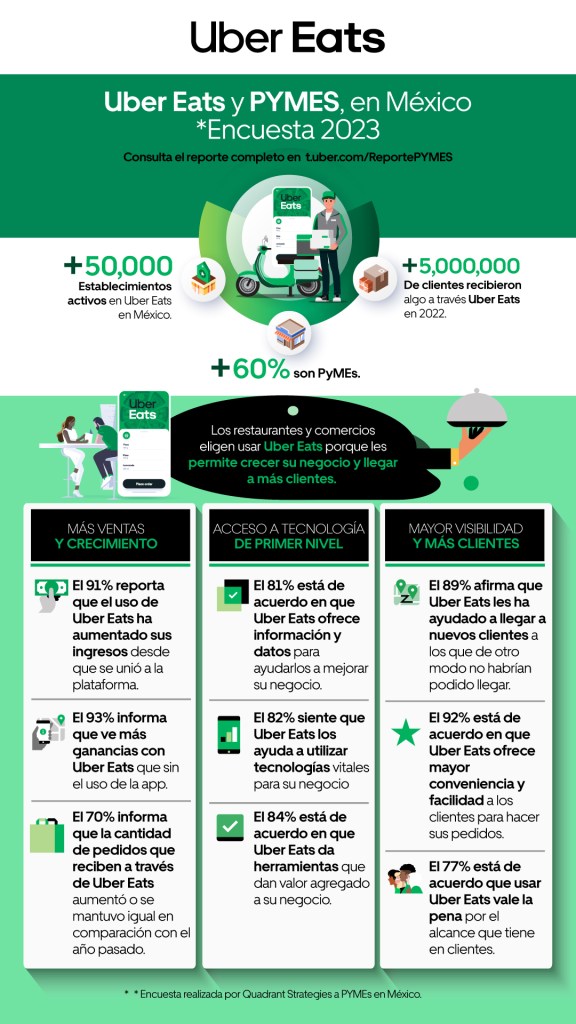 De acuerdo con datos de la empresa, en México Uber Eats cuenta con más de 50 mil establecimientos registrados activos de los cuales más del 60% son pequeñas y medianas empresas que contribuyen a la reactivación de economías locales. Para conocer más sobre la encuesta realizada por Quadrant Strategies, de diciembre de 2022 a enero 2023, ingresa a t.uber.com/ReportePYMES.