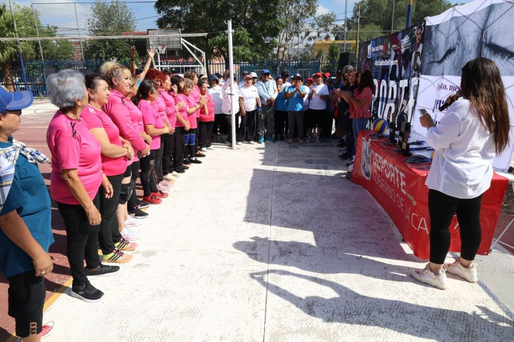 Personas de la tercera edad, participan en torneo de cachibol.