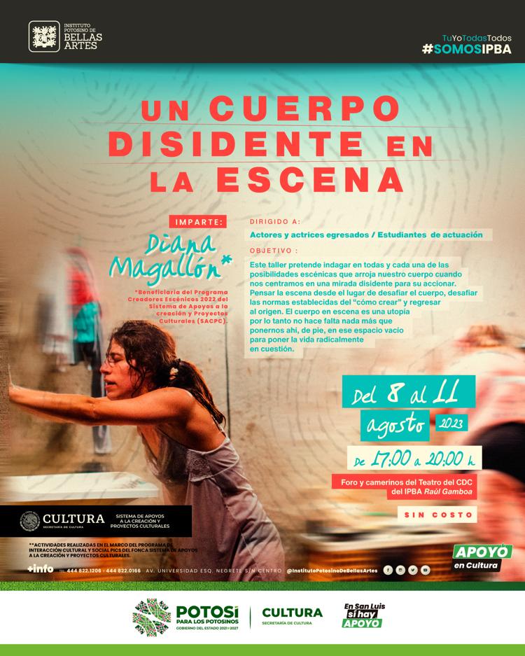 En San Luis Potosí, sí hay apoyo a la cultura y las artes, por ello la Secretaría de Cultura de San Luis Potosí, a través del Instituto Potosino de Bellas Artes, anuncia el taller “Un cuerpo disidente en la escena”, que será impartido por la actriz y directora de teatro Diana Magallón, del 8 al 11 de agosto 2023, en un horario de 17:00 a 20:00 horas, en los camerinos del Centro de Difusión Cultural del IPBA “Raúl Gamboa”.