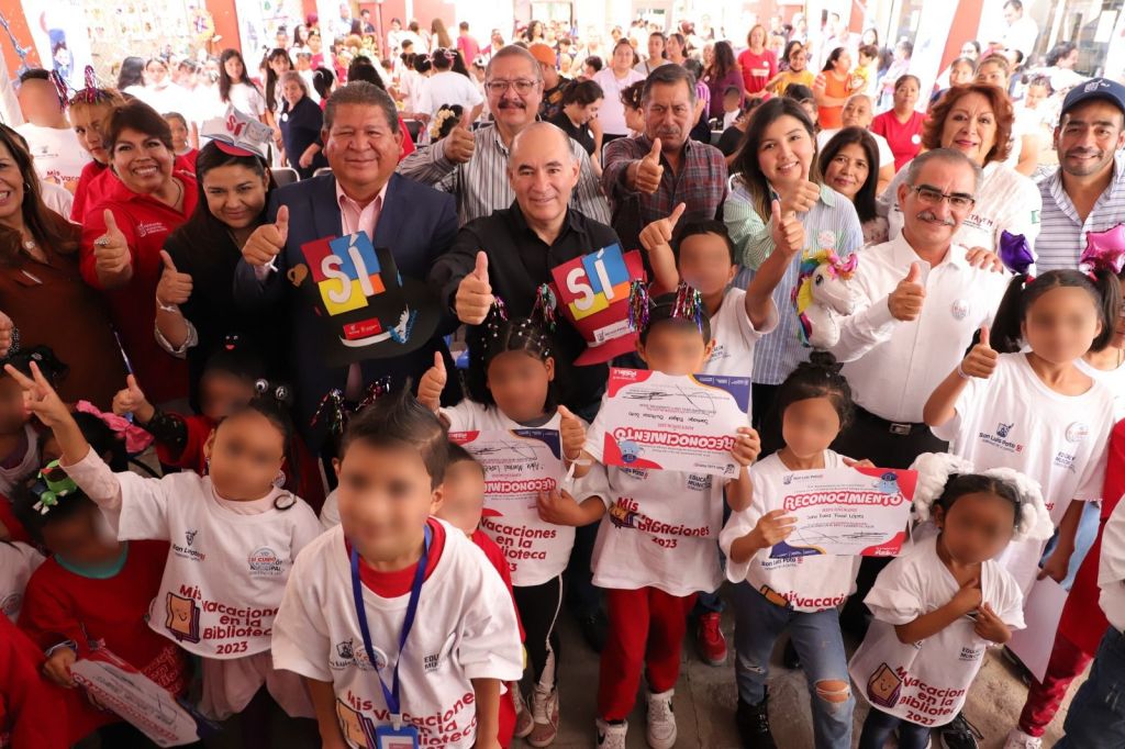 Con la participación de más de 500 alumnos en talleres y actividades recreativas, artísticas y culturales, concluyó el programa municipal “Mis Vacaciones en la Biblioteca” en su edición 2023, clausurado este viernes por el Alcalde Enrique Galindo en la Delegación de Villa de Pozos. Ante más de un centenar de niños reunidos en la biblioteca Francisco de Asís Castro de esta demarcación, el Presidente Municipal de la Capital felicitó a quienes utilizaron su tiempo libre en continuar su preparación educativa y de ampliar sus conocimientos culturales de una manera divertida en las bibliotecas municipales.