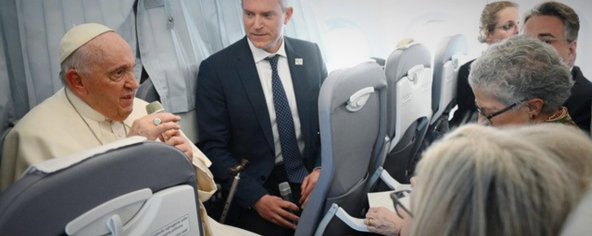 Papa Francisco en rueda de prensa al volver de Lisboa a Roma, este 6 de agosto. Crédito: Daniel Ibáñez / ACI Prensa.
