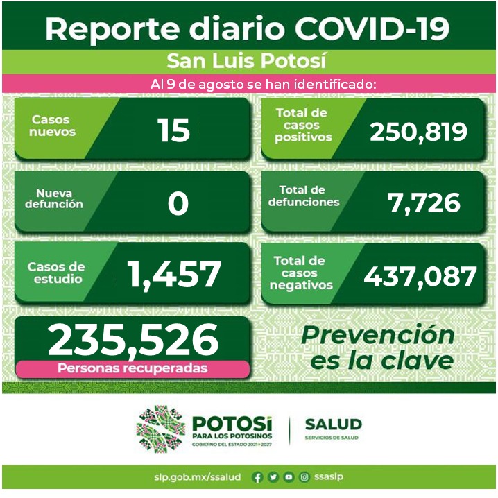 En cuanto a los casos Covid-19 en el Estado, se dan a conocer 15 nuevos contagios, confirmando el Comité Estatal para la Seguridad en Salud y los Servicios de Salud 250 mil 819 casos totales de esta enfermedad.