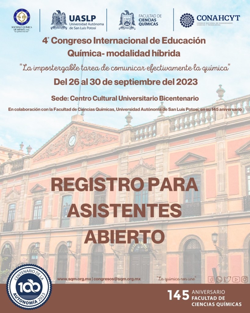 La Sociedad Química de México, A.C., en colaboración con la Universidad Autónoma de San Luis Potosí (UASLP) llevan a cabo la organización del 4º Congreso Internacional de Educación Química “La impostergable tarea de comunicar efectivamente la química” a realizarse del 26 al 30 de septiembre.