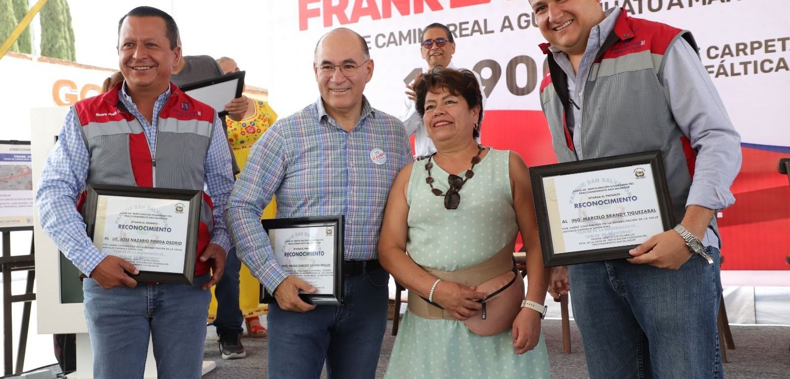 Vecinos entregan reconocimientos al alcalde, al Director de Obras Públicas, Nazario PIneda y al Secretario del Bienestar, Martín Juárez Córdova.