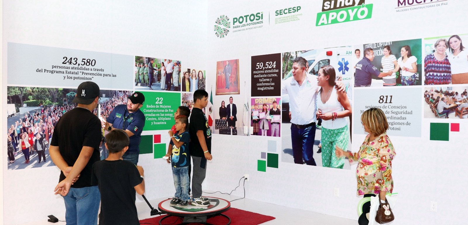 La titular de la dependencia estatal, Ana Elisa Loredo Torres, explicó que, el stand ofrece la posibilidad de aprender sobre diferentes temas de prevención a través del apoyo al sano esparcimiento y convivencia familiar, por lo que las y los visitantes pueden disfrutar desde grabar un video en un Photo Booth 360°, estimular el pensamiento en el tangram de la Estrategia Redes de Mujeres Constructoras de Paz (Mucpaz), aprender a cuidarse en redes sociales con la campaña “Mi Yo Digital” e incluso dibujar su pensamiento sobre los riesgos del ciberespacio.