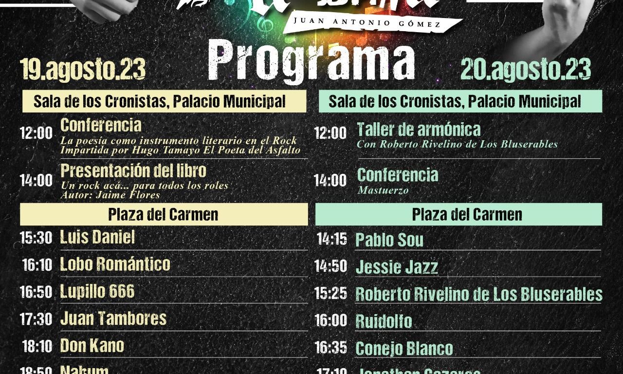 A partir de las 15:30 horas. Plaza del Carmen. Participan grupos y solistas: Luis Daniel, Lobo Romántico, Lupillo 666, Juan Tambores, Don Kano, Nahum, Emmanuel López “Bohemia y Rock”, Hugo Tamayo “El poeta del rock” y cierra Beto Blues.