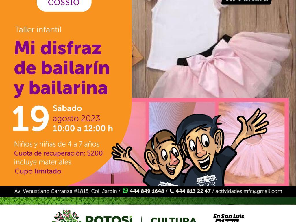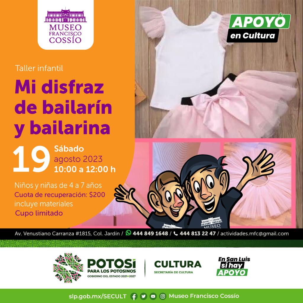 El taller “Mi disfraz de bailarín y bailarina”, para público infantil de 4 a 7 años, se llevará a cabo en un horario de 10:00 a 12:00 horas, y al terminar se tendrá el Taller de costura básica para niñas y niños, de 8 a 12 años, en un horario de 12:00 a 14:00 h, ambos tienen una cuota de recuperación de $200.00 cada uno y ya incluye el material necesario para realizar la actividad.