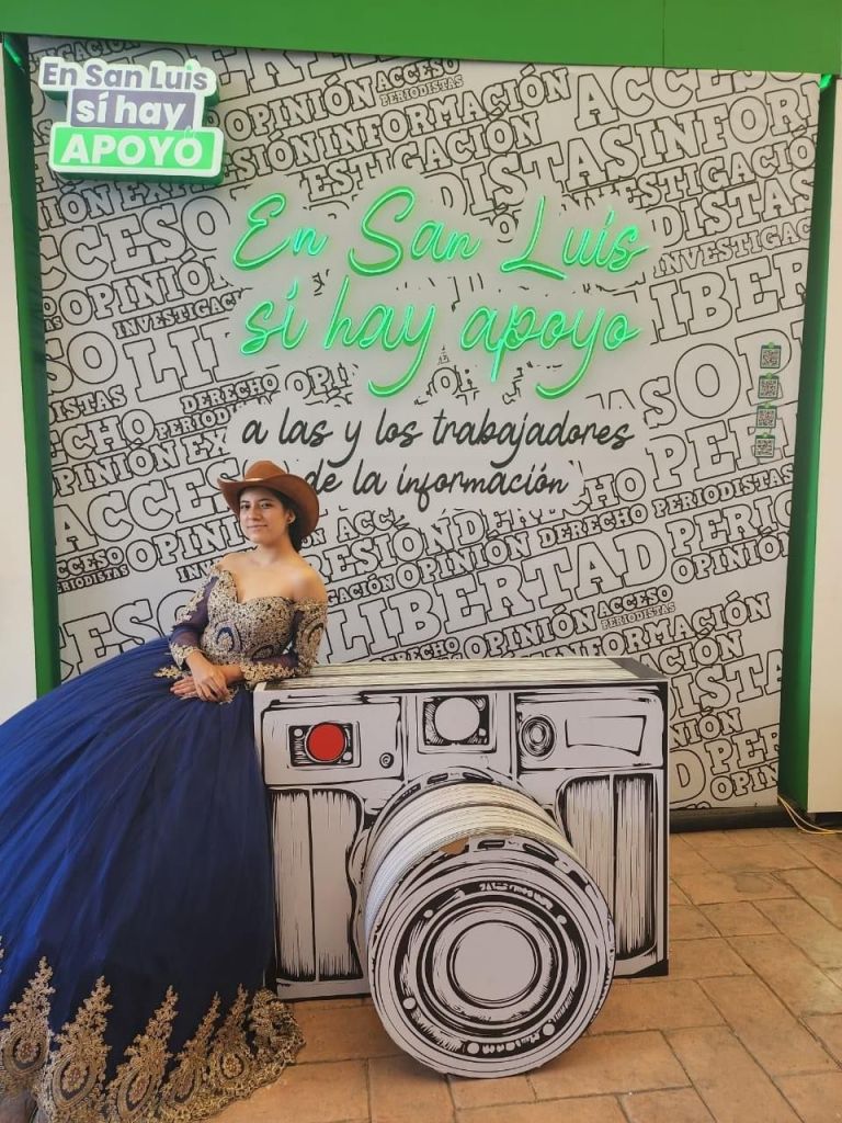 La joven potosina, posó en las letras monumentales en la entrada de la Feria, el stand de la Coordinación General de Comunicación Social y de otras dependencias, así como otros espacios.
