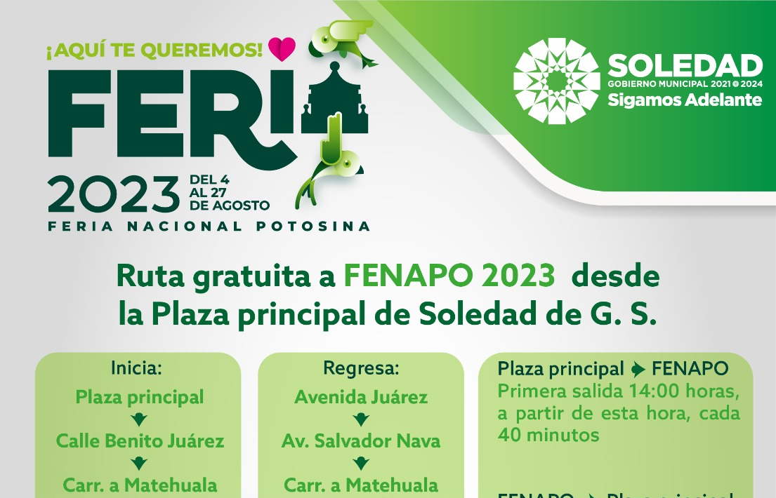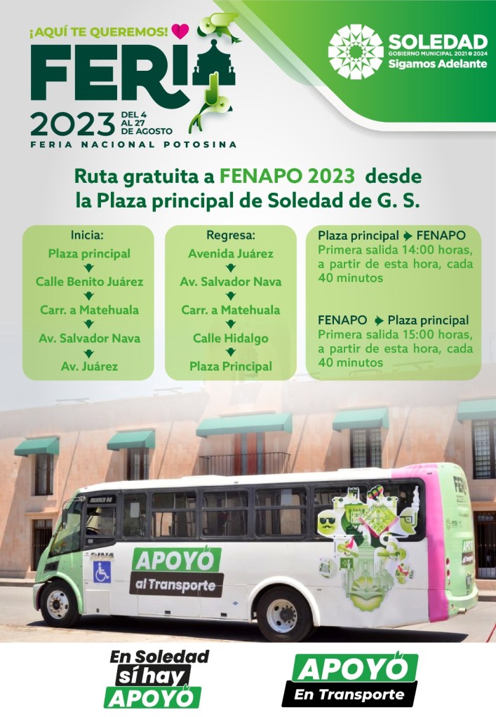 En apoyo a la economía de las familias soledenses, y para incentivar su participación en la edición 2023 de la Feria Nacional Potosina, se brinda transporte gratuito desde la plaza principal del municipio hasta las instalaciones feriales.
