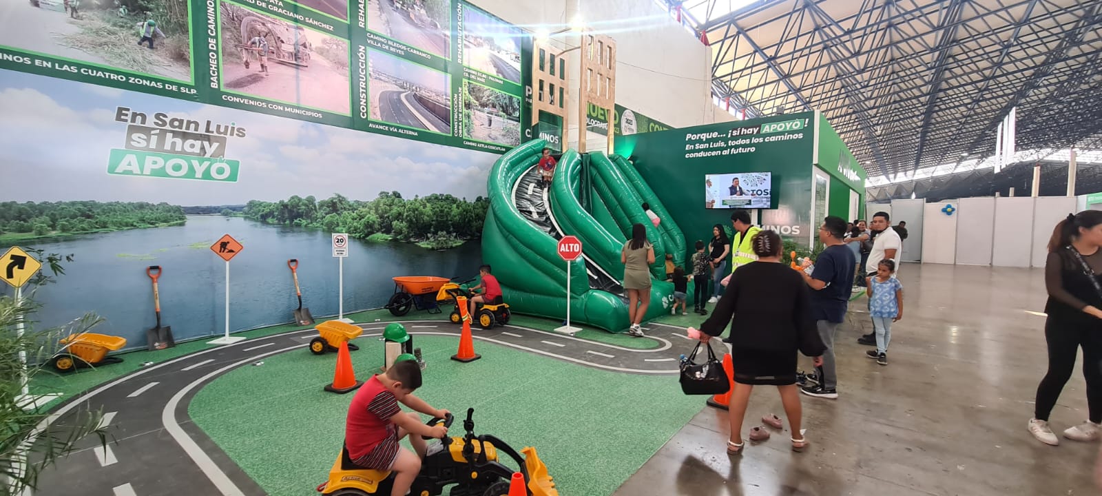 El módulo interactivo de la Junta Estatal de Caminos (JEC), instalado en la Feria Nacional Potosina (Fenapo), logra atraer la atención de personas de todas las edades, al contar con un circuito lúdico de aprendizaje dirigido a niñas y niños, así como material informativo para las y los adultos, en el que se informa sobre las acciones y obras de infraestructura carretera que se desarrollan en las cuatro regiones.