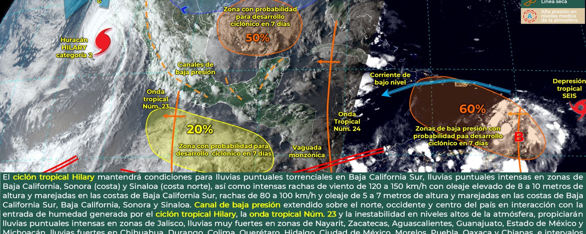 Viento con rachas de 60 a 80 km/h, oleaje de 2 a 4 metros de altura y marejadas, durante la mañana: costa norte de Sinaloa y sur de Baja California Sur.