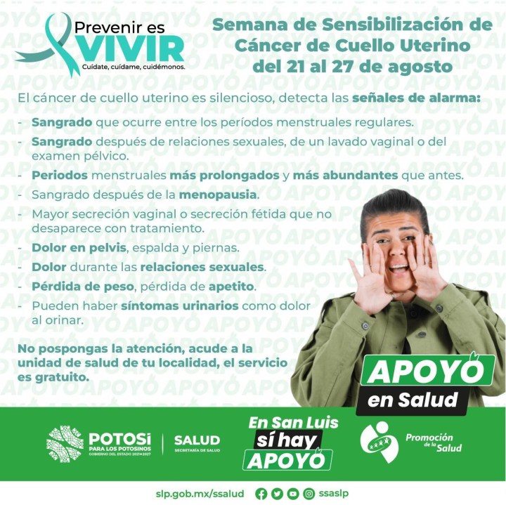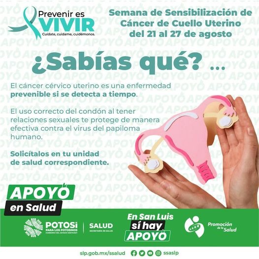 En todas las unidades de salud de los Servicios de Salud del 21 al 27 de agosto se llevarán a cabo actividades de Jornadas de toma de citología cervical, Ferias de salud, Pláticas de sensibilización de cáncer cervicouterino, el jueves 24 de agosto se va a transmitir la videoconferencia “¿Cómo sé que tengo cáncer cervicouterino?”, que impartirá la Dra. María Inocencia Hernández Gallegos desde el Hospital General de Rioverde; Caminata de sensibilización, el viernes 25 agosto saliendo a las 8:00 de la mañana de la Glorieta Hidalgo hasta la Plaza Principal en Ciudad Valles, todo en el marco de la Semana de Sensibilización en Cáncer de Cuello Uterino.