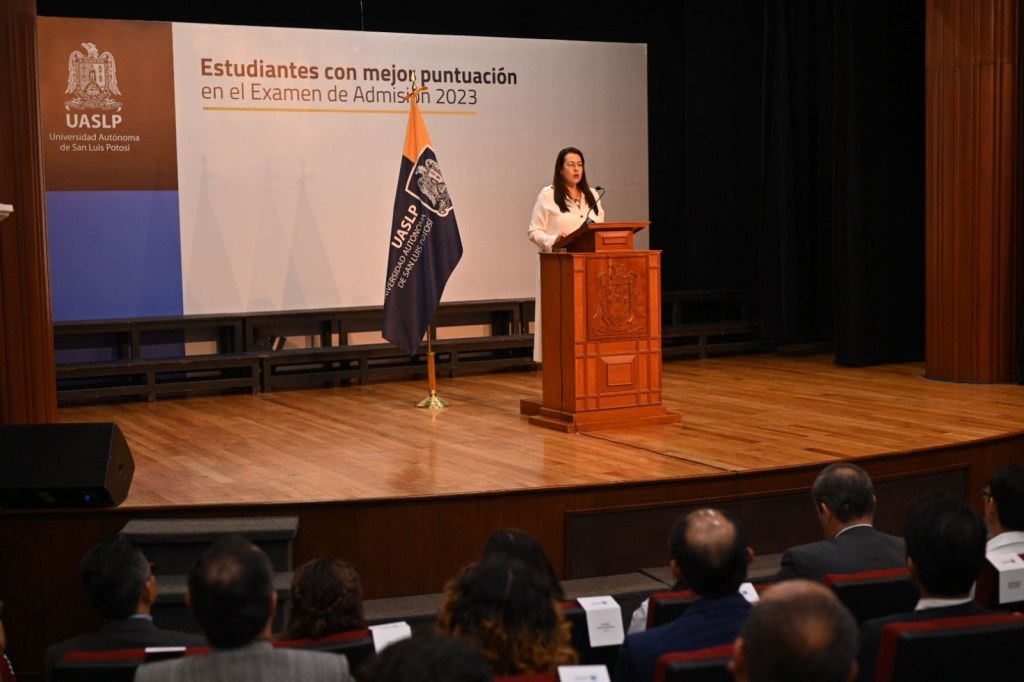 En ceremonia efectuada en el Auditorio “Rafael Nieto Compeán” de la UASLP, se realizó la entrega de reconocimientos a las y los estudiantes que obtuvieron la mejor puntuación en el examen de admisión 2023. Cabe destacar que son alumnas y alumnos del nivel medio superior provenientes de instituciones públicas, quienes lideran los primeros lugares de puntuación en el examen.
