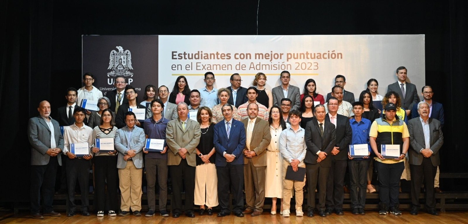En ceremonia efectuada en el Auditorio “Rafael Nieto Compeán” de la UASLP, se realizó la entrega de reconocimientos a las y los estudiantes que obtuvieron la mejor puntuación en el examen de admisión 2023. Cabe destacar que son alumnas y alumnos del nivel medio superior provenientes de instituciones públicas, quienes lideran los primeros lugares de puntuación en el examen.