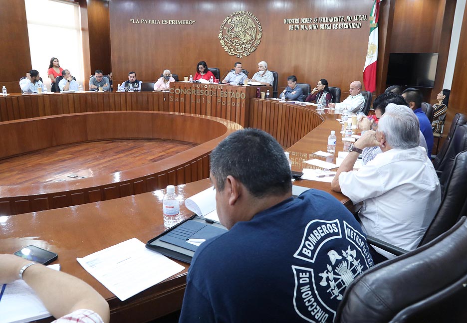 Diputadas y diputados de la Comisión de Puntos Constitucionales del Congreso del Estado, sostuvieron una reunión con integrantes del Cuerpo de Bomberos Metropolitanos de San Luis Potosí, de Matehuala, así como del Patronato del Organismo para analizar las iniciativas que tienen que ver con la creación de una nueva Ley del Sistema de Bomberos del Estado, y reformas constitucionales y a diversas leyes estatales para garantizar su legalidad y operatividad.
