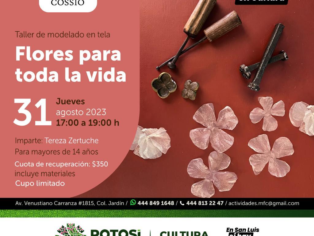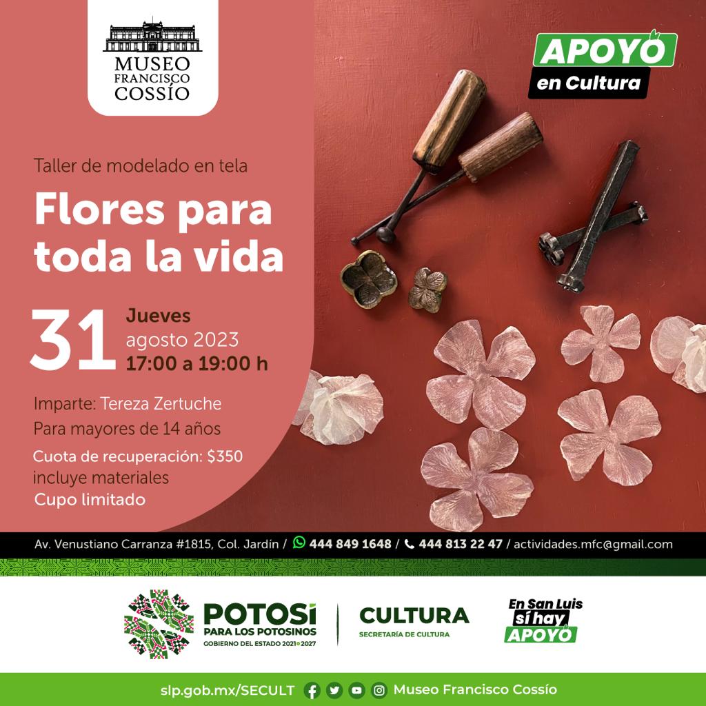 En San Luis Potosí si hay apoyo en cultura, y en el marco de la exposición temporal «Antonina & Tereza, El Tiempo & las Novias» que se encuentra en el Museo Francisco Cossío, la Secretaría de Cultura de San Luis Potosí invita a la comunidad en general a participar en el Taller de Modelado en Tela «Flores para Toda la Vida», que se llevará a cabo el próximo jueves 31 de agosto a las 17:00 h, en las instalaciones del este museo.