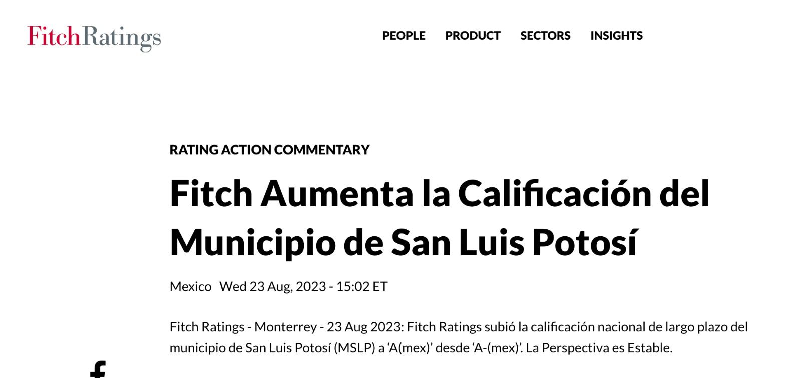 Gracias al fortalecimiento de los resultados presupuestarios del Ayuntamiento de San Luis Potosí, la importante recomposición de los ingresos propios del municipio y una contención del gasto operativo, la empresa calificadora internacional Fitch Ratings subió la calificación nacional de largo plazo del municipio de San Luis Potosí a “A” con perspectiva estable, cuando anteriormente era “A-”.