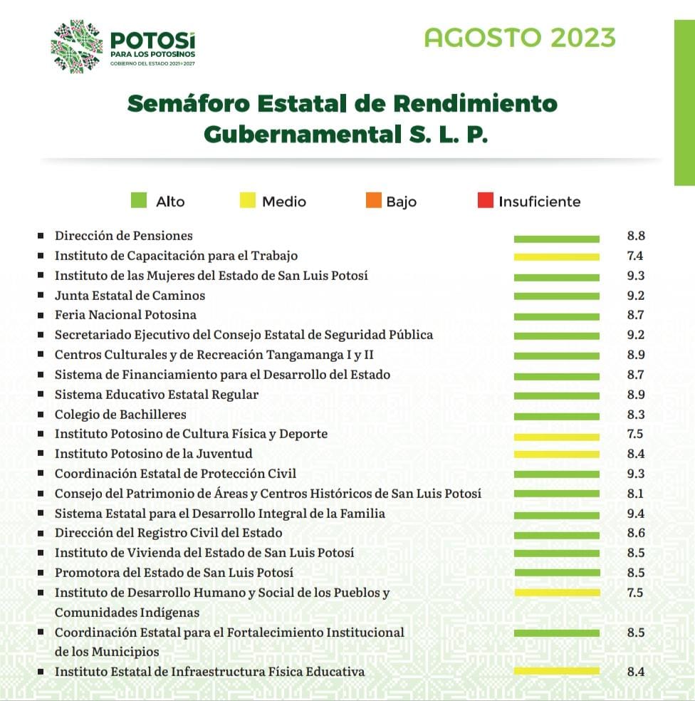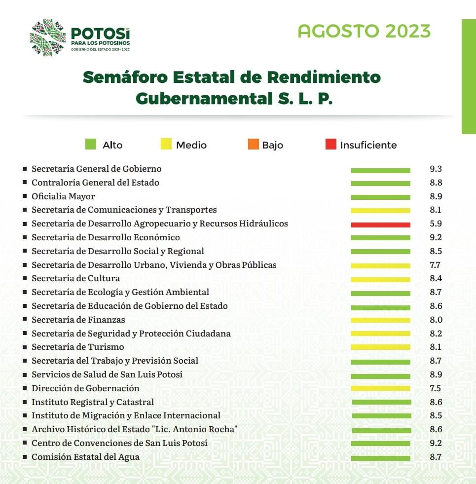 En la tarea de mejora permanente de la administración estatal, el Gobernador de San Luis Potosí, Ricardo Gallardo Cardona, dio a conocer el Semáforo de Rendimiento Gubernamental correspondiente al mes de agosto, que evalúa el desempeño de las y los funcionarios y dependencias, tras refrendar el compromiso de continuar con una estrategia que atienda las necesidades más apremiantes de las y los potosinos y la transformación del Estado.