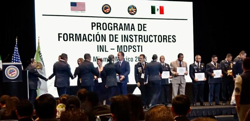 La ceremonia de entrega de reconocimientos, encabezada por el Embajador de los Estados Unidos en México, Ken Salazar, tuvo lugar el pasado viernes 25 de agosto y contó con la presencia del secretario de Seguridad y Protección Ciudadana del Municipio de San Luis Potosí, Comisario Juan Antonio Villa Gutiérrez. Este programa de formación de instructores, convocado por la Embajada de los Estados Unidos de América a través de la oficina de INL en México y el Instituto de Formación de Miami-Dade, busca fortalecer el desarrollo académico de las y los policías municipales, contribuyendo así a una mejora sustancial en las capacidades de seguridad y atención a la ciudadanía.
