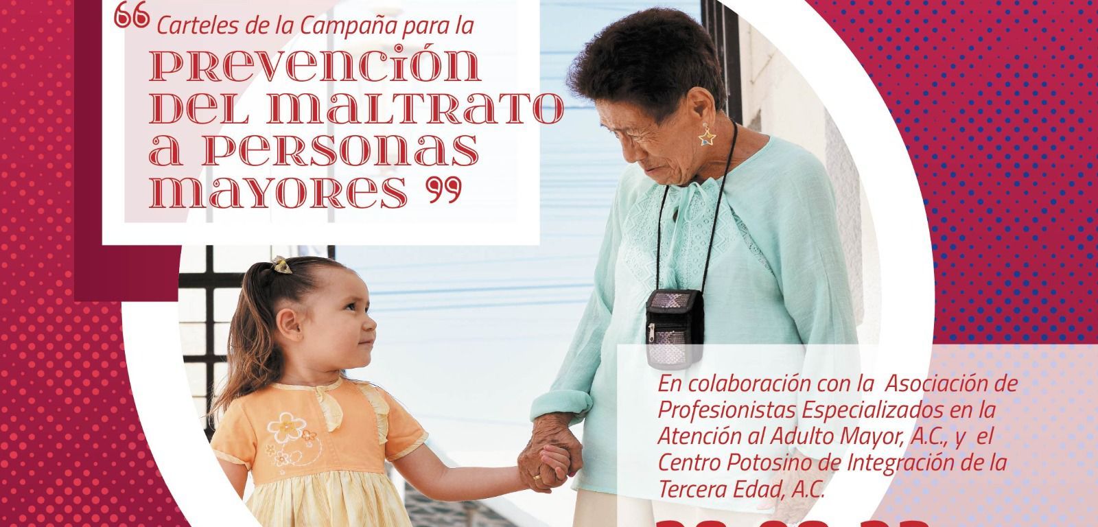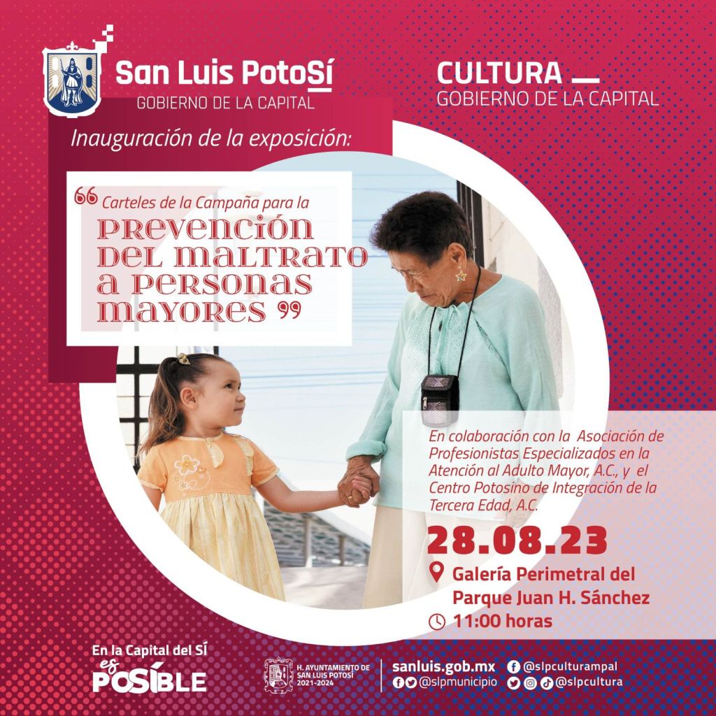 En el marco del Día Nacional de las Personas Adultas Mayores, el Gobierno de la Capital y la Dirección de Cultura Municipal presentan la campaña de prevención del maltrato a personas mayores, con una muestra fotográfica y de diseño gráfico, elaborada a partir del trabajo social realizado por la “Asociación de Profesionistas Especializados en la Atención del Adulto Mayor” y el “Centro Potosino de Integración de la Tercera Edad”.
