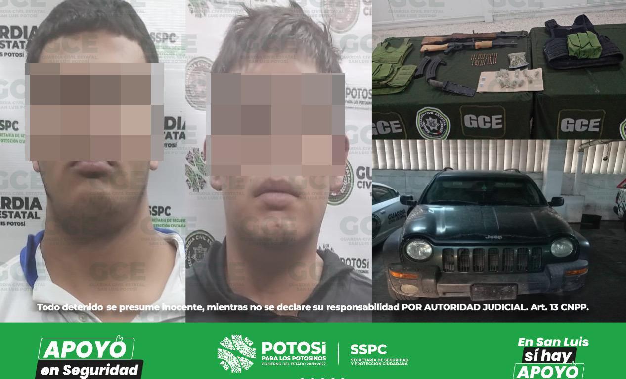 Tras el seguimiento a un reporte atendido en el Sistema de Emergencias 911 sobre un probable hecho de privación ilegal de la libertad, agentes de la Guardia Civil Estatal (GCE) acudieron al lugar de los hechos y detuvieron a dos presuntos criminales con armamento, equipo táctico y droga.