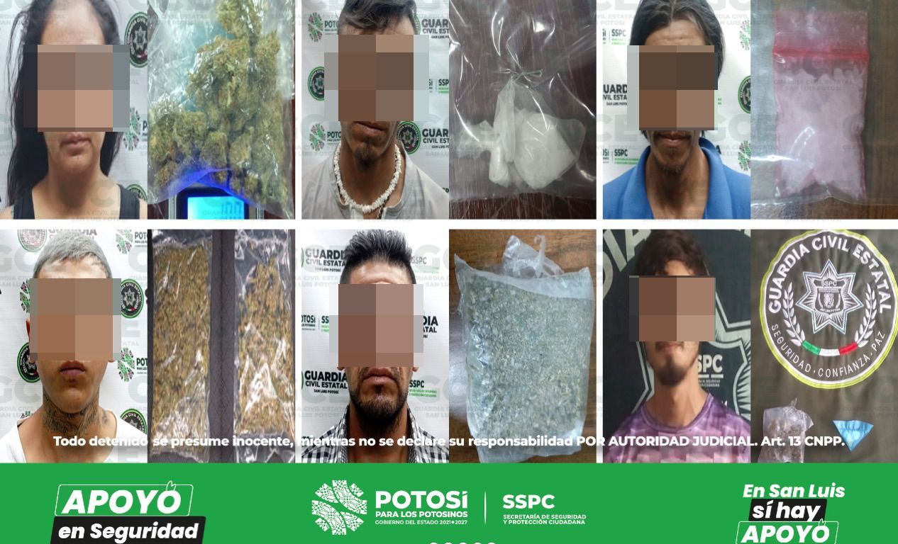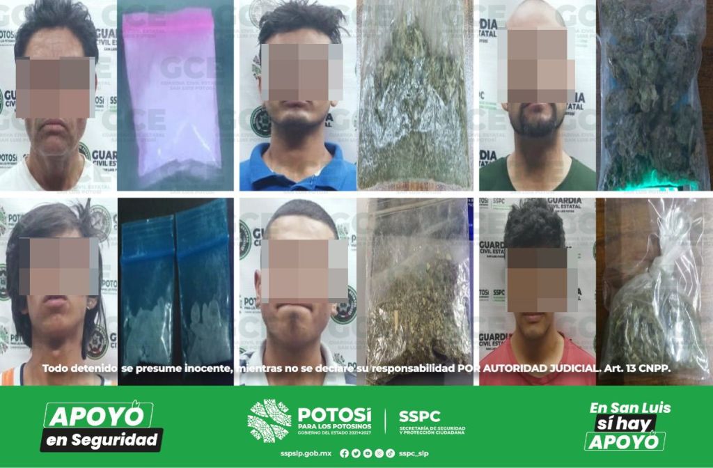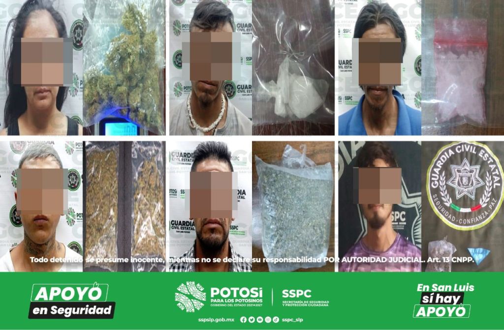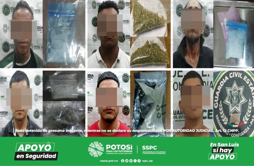 En el municipio de Soledad de Graciano Sánchez, sobre la zona centro, Gustavo “N” de 55 años de edad, fue detenido con una dosis de “cristal”; de igual manera, José “N” de 29 años fue capturado con dos dosis de “cristal”; también en la colonia Francisco Sarabia, a Guillermo “N” de 25 años lo sorprendieron con una dosis de marihuana; José “N” de 26 años fue sorprendido con un envoltorio que contenía una dosis de “cristal”, en el fraccionamiento Terremoto.