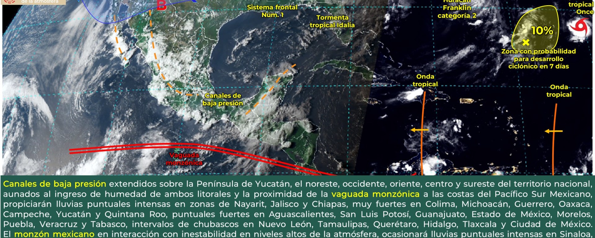 Intervalos de chubascos con lluvias puntuales fuertes (25 a 50 mm): Sonora, Sinaloa, Durango, Zacatecas, Aguascalientes, Colima, Michoacán, Ciudad de México, Tlaxcala, Tabasco y Campeche.
